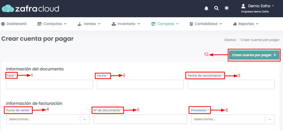 - Una vez completados todos los datos, haremos clic en Crear cuenta por pagar +.