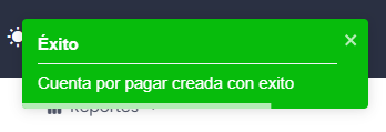 Se nos emitirá el siguiente mensaje indicando que la cuenta por pagar fue creada con éxito.