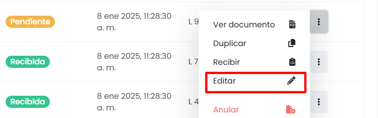 Cuando se despliegue la pantalla se nos mostrará las solicitudes, podemos buscar en específico en el apartado de la fecha de emisión, ya vista la solicitud nos desplazaremos a los tres puntitos y daremos clic en editar.