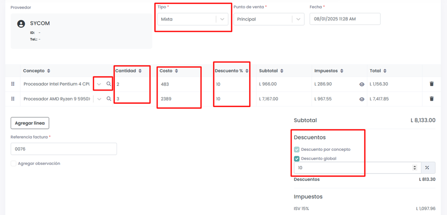 - Tipo: Modo de impuesto por compra (Mixta, Exenta o Exonerada)