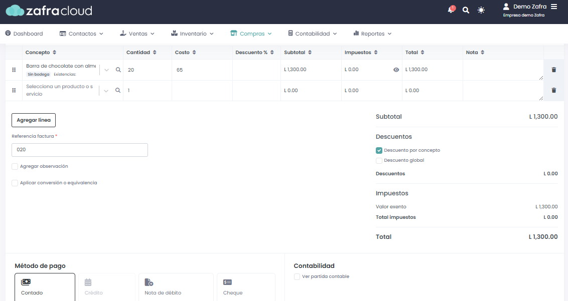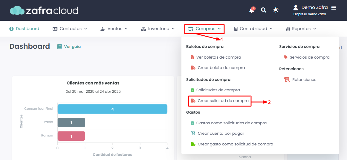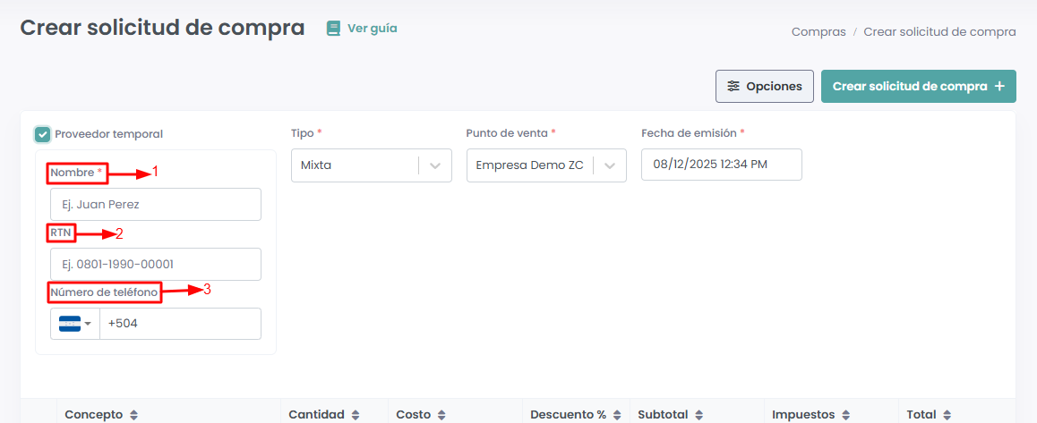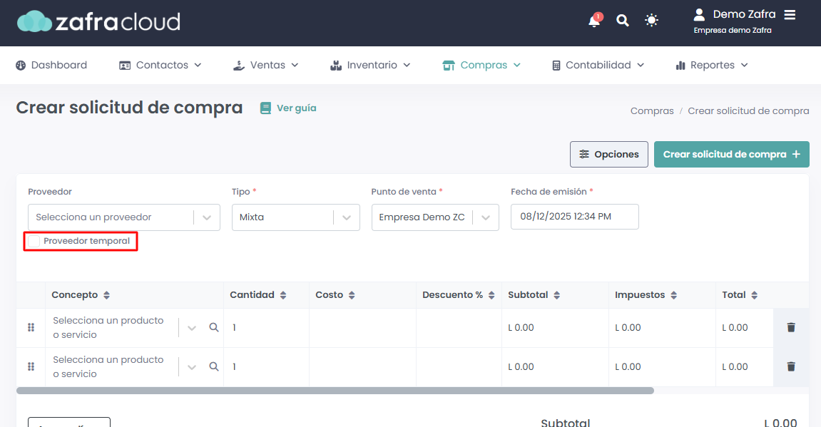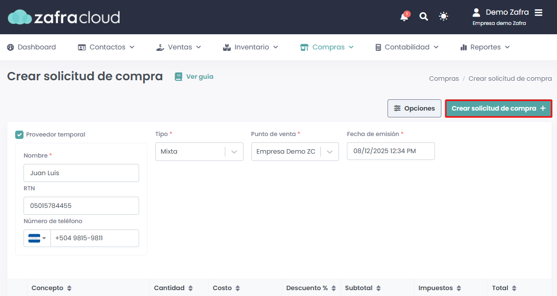 Ingresarás al módulo de Compras → Crear solicitud de compra.