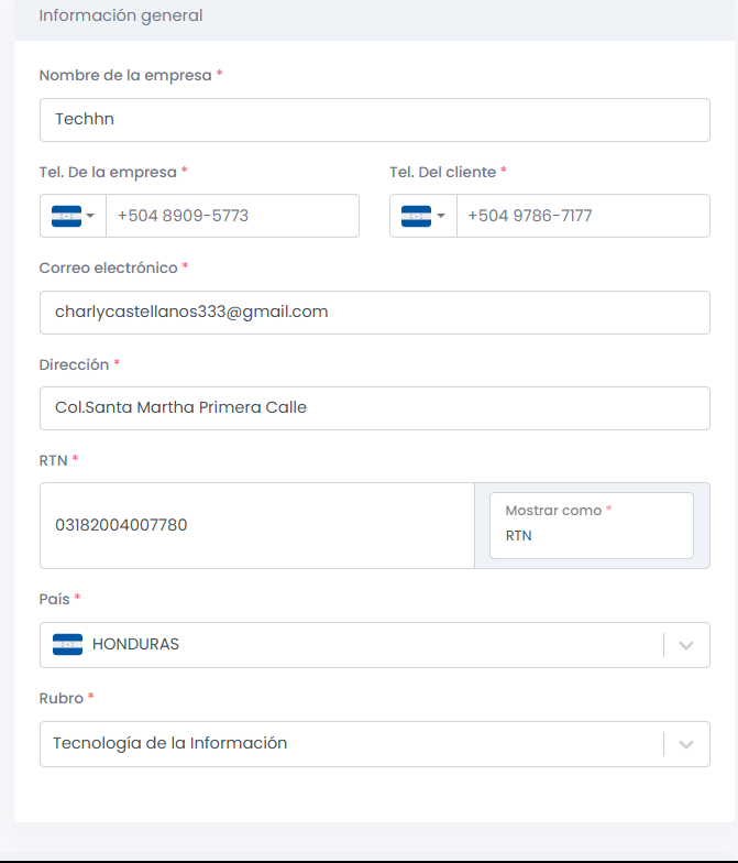 - Tel. de la Empresa: El número de celular / fijo en la cual se comunicarían sus clientes.