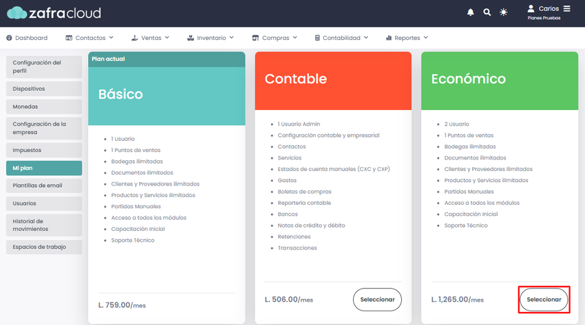 Tendremos la siguiente pantalla, con los diferentes planes. Cuando ubiquemos el plan al que deseamos trasladarnos haremos clic sobre el botón “Seleccionar”.