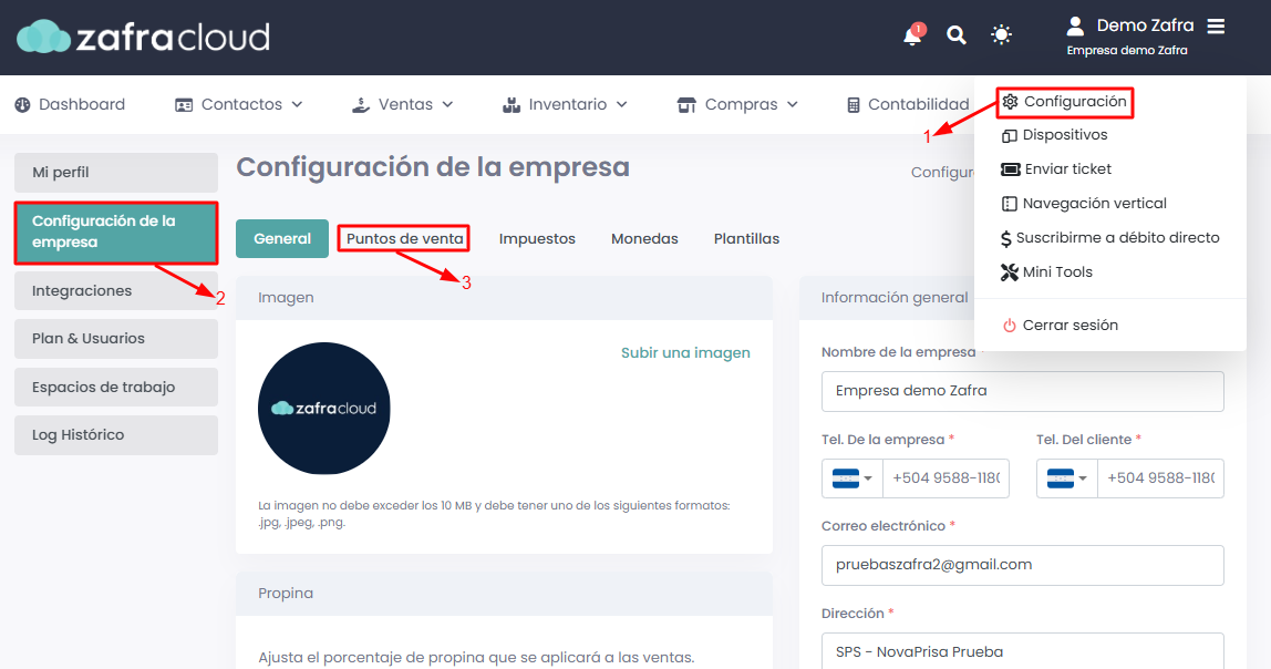 Ingresaremos a Configuración → Configuración de la empresa → Puntos de venta