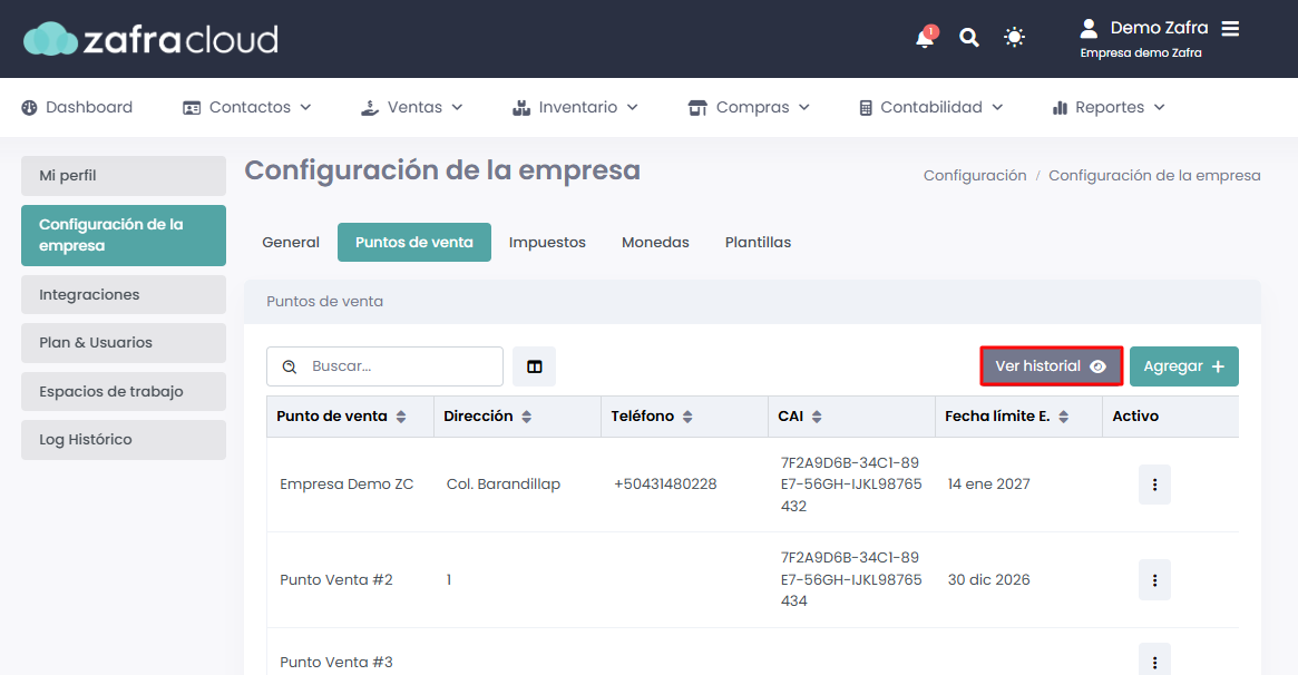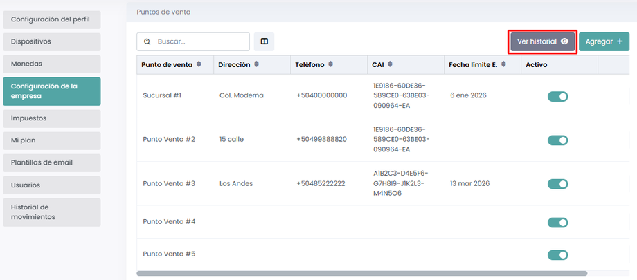 Tendremos la vista a todos nuestros puntos de venta configurados hasta el momento y al presionar “Ver Historial” tendremos podremos visualizar el historial de cada uno.