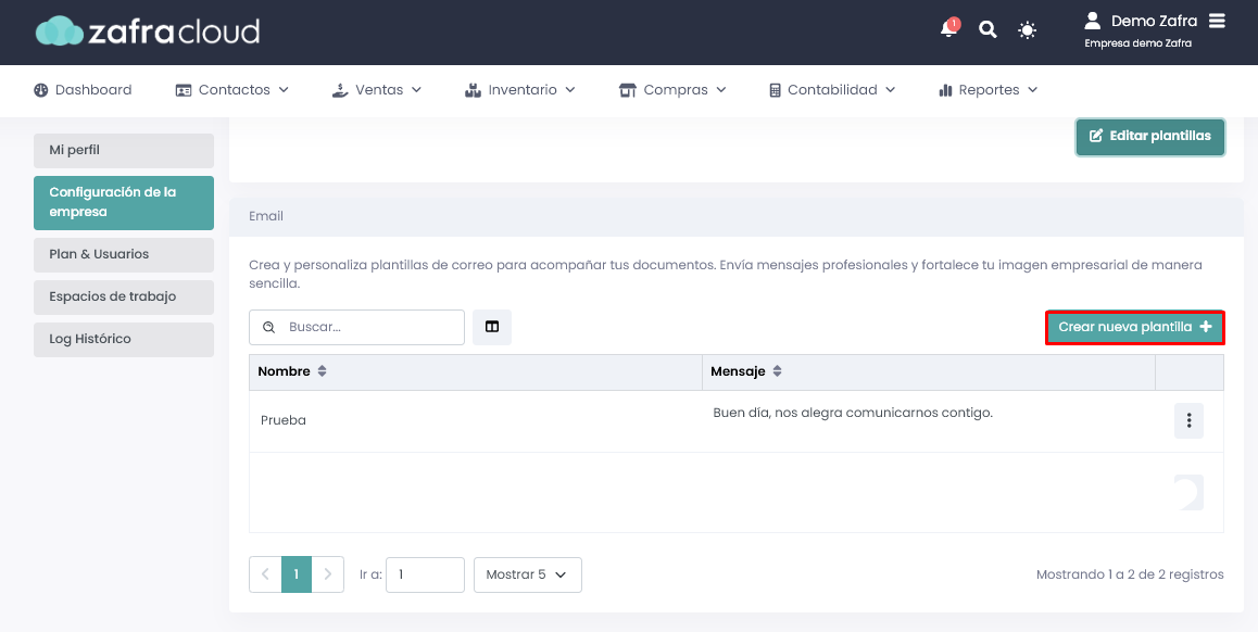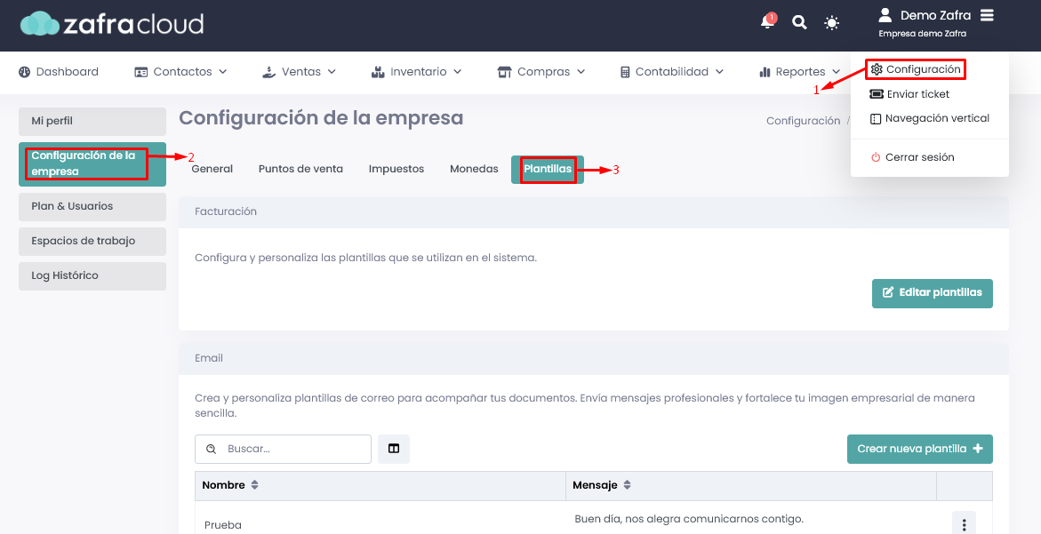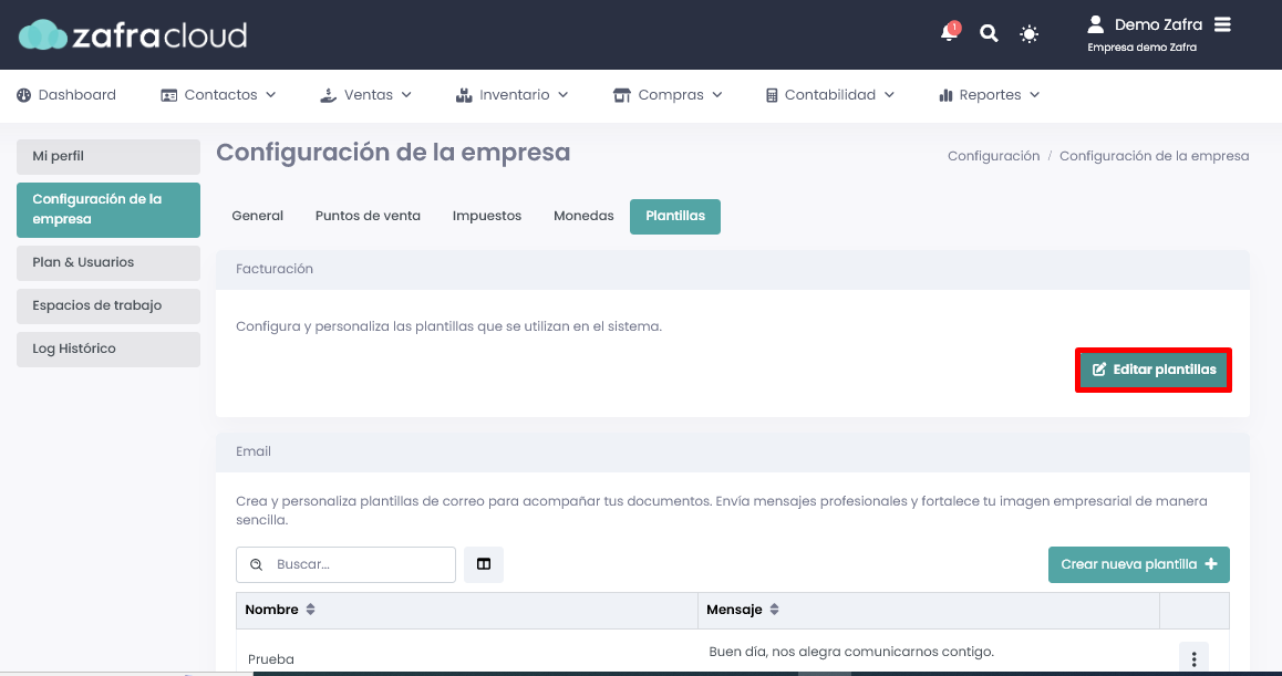 Ingresar a Configuración → Configuración de la empresa → Plantillas