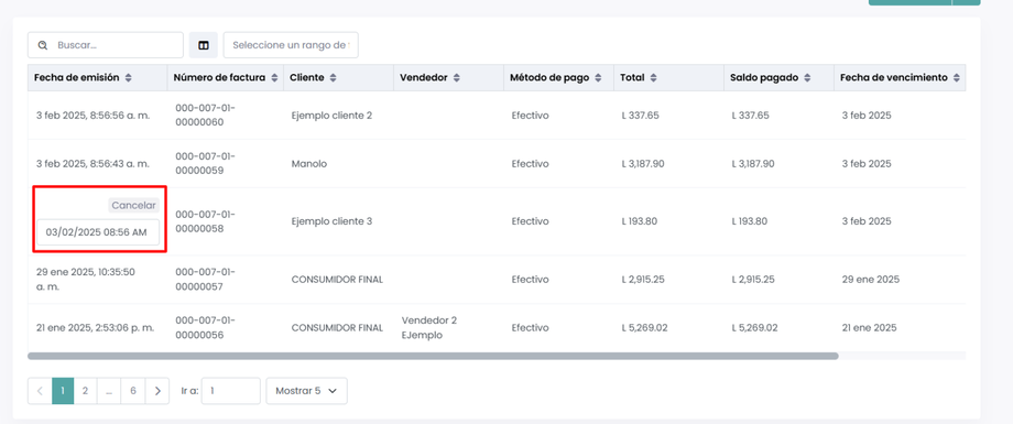 Nota: Al momento de cambiar la fecha de una factura, esta se ve restringida por las facturas que estén antes y después, ya que el correlativo de la factura debe seguir un orden secuencial.