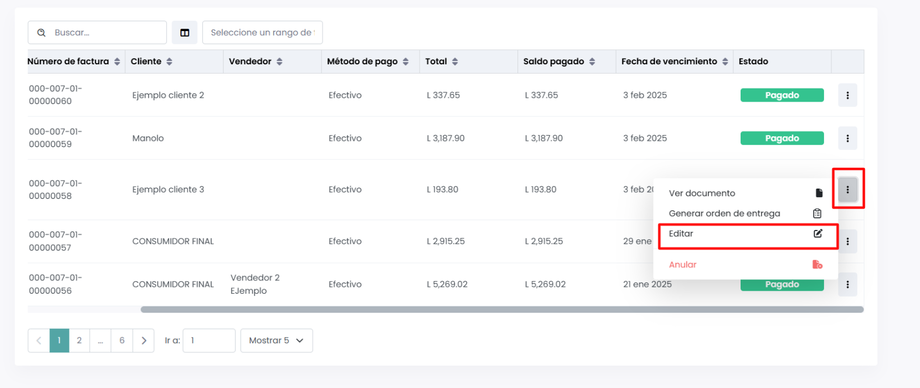 Se mostrarán en pantalla todas nuestras facturas podremos cambiar su fecha en la columna de "Fecha de emisión" o yendo a los tres puntos clic en botón de editar y "Fecha de emisión".