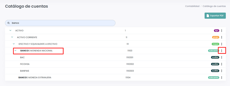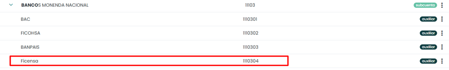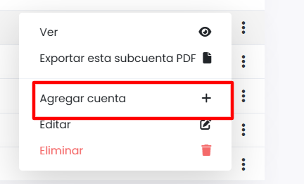• Se desplegará la siguiente ventana, donde se deberá localizar la subcuenta de Banco Moneda Nacional. A continuación, haga clic en los tres puntos suspensivos y seleccione la opción "Agregar cuenta"