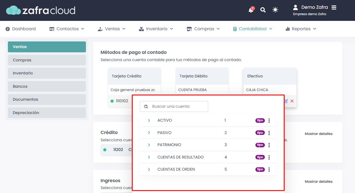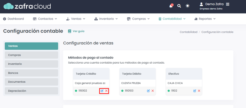 Configurar las cuentas contables para tus métodos pagos. Solo deberás seleccionar el lápiz de color azul y esto te desplegará el catálogo de cuentas.