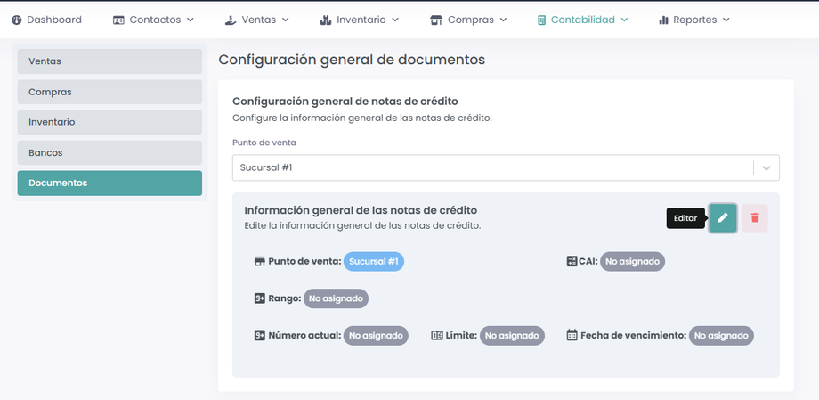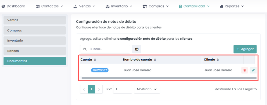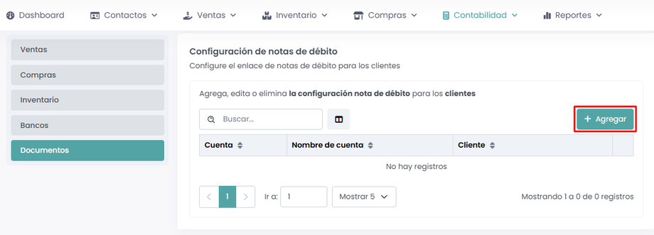 Tendremos la siguiente vista y, para configurar una nota de débito, oprimiremos sobre el botón de + Agregar.