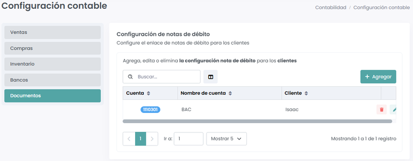 Para agregar la configuración de un cliente para una nota de débito daremos sobre el botón de “+Agregar”.