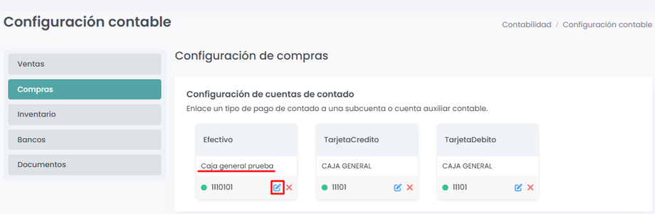 Se presentará la siguiente ventana y haremos clic sobre el lápiz para realizar las configuraciones requeridas, sobre las cuentas que deseamos modificar.