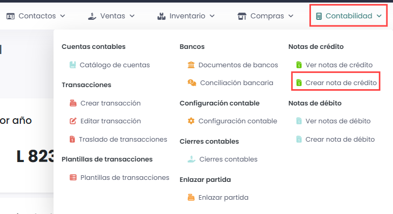 - Ingresar al módulo de Contabilidad → Crear nota de crédito
