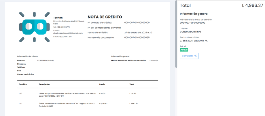 Una vez en aceptar se creará el documento de NOTA DE CRÉDITO