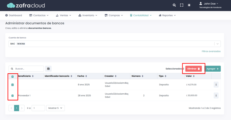 También es posible eliminar múltiples documentos bancarios seleccionando las casillas a la izquierda de cada documento y haciendo clic en el botón “Eliminar”, ubicado en la parte superior del reporte.