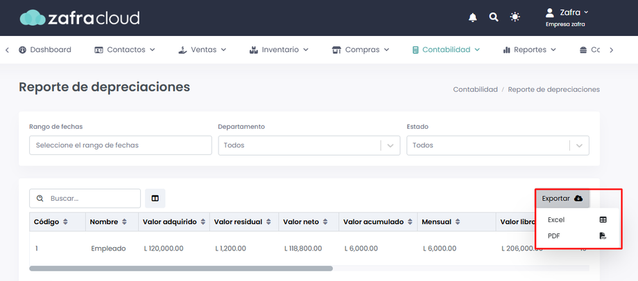 Ingresaremos al módulo de Contabilidad -> Reporte de depreciaciones.