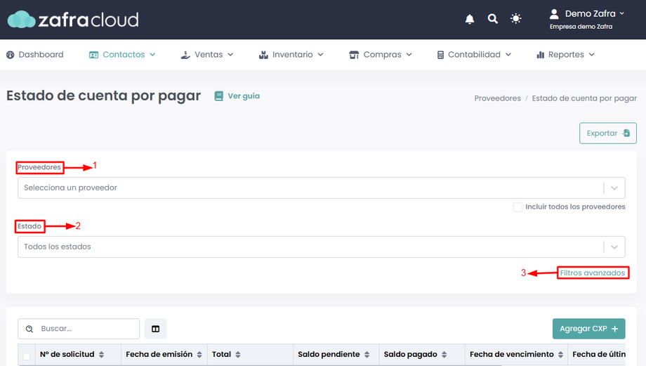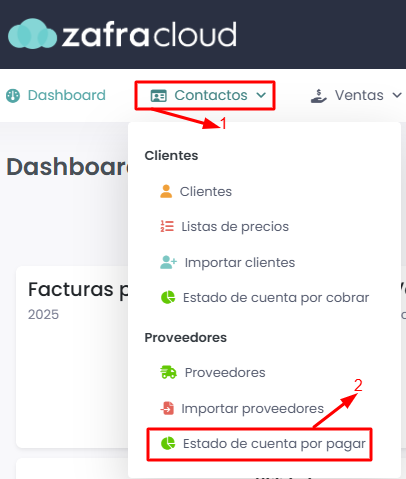 - Ingresar al módulo de Contactos → Estado de cuenta por pagar.