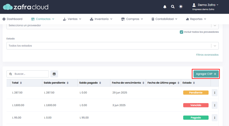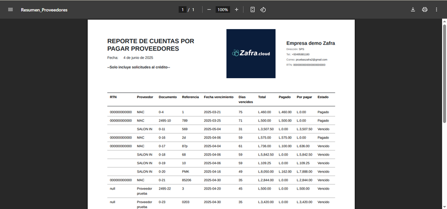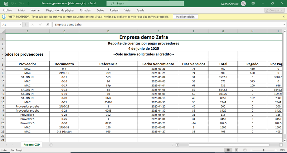- Saldo pagado: Monto que ya ha sido abonado al proveedor, parcial o totalmente.