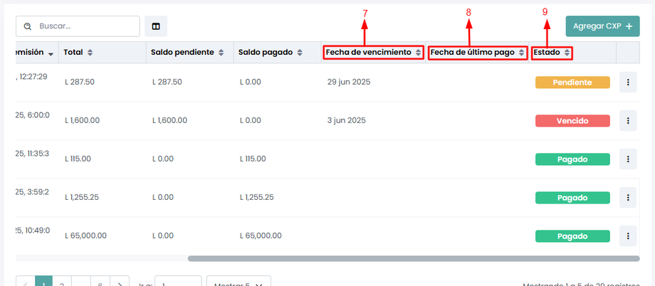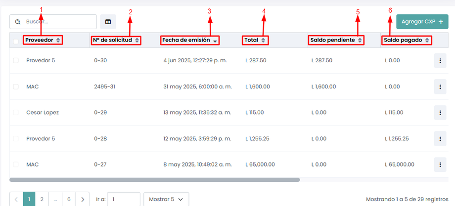 - Una vez seleccionados los filtros correspondientes, el sistema nos mostrará nuestras cuentas por pagar con la siguiente información: