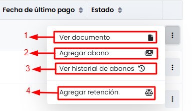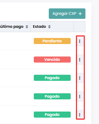 - Agregar abono: Opción para registrar un pago parcial (abono) a la deuda o factura del proveedor.