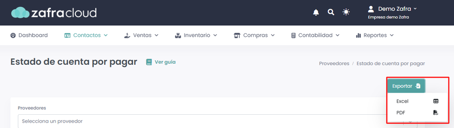 Si requieres exportar tu reporte de CXP para un mayor control, lo puedes hacer por medio de un Excel o un PDF según tus necesidades.