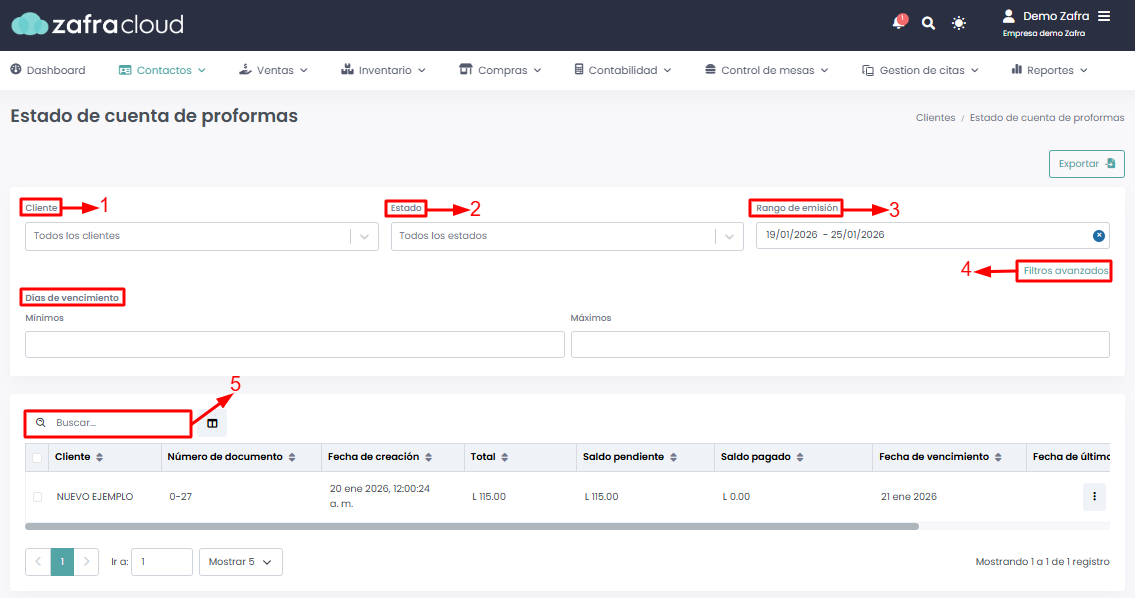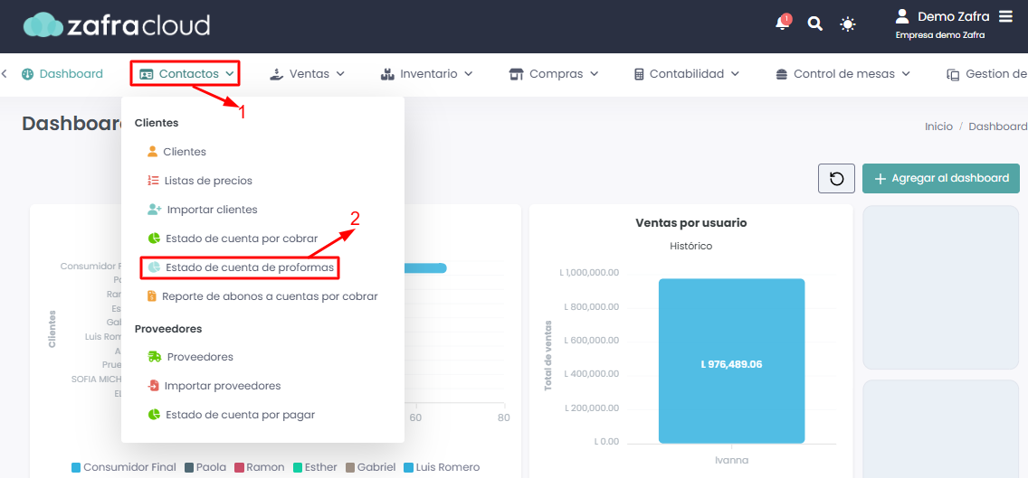 Ingresemos a Contactos → Estado de cuenta de proformas.