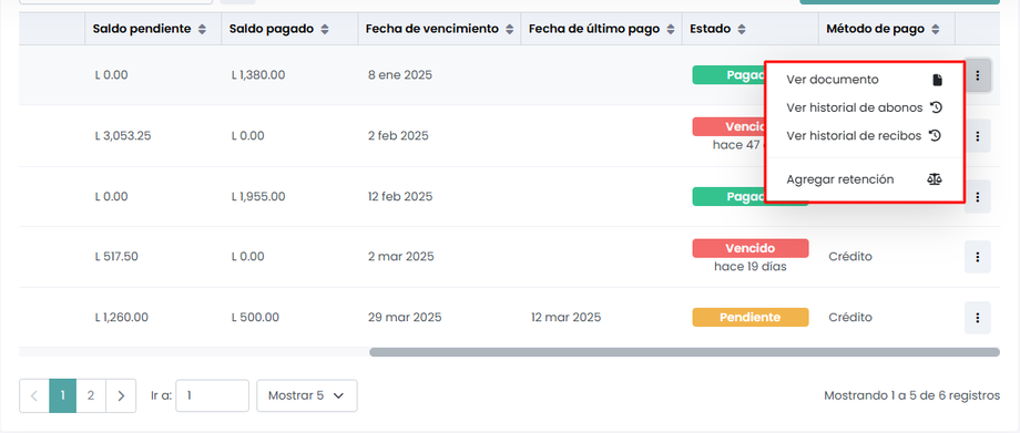 • Filtrado avanzado: Puedes filtrar por días de vencimiento, fecha de emisión o método de pago.