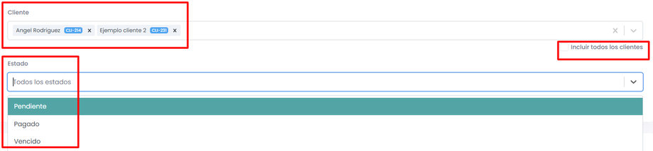 • Estado: Aquí seleccionaremos el estado de la cuenta (Pendiente, Pagado o Vencido)