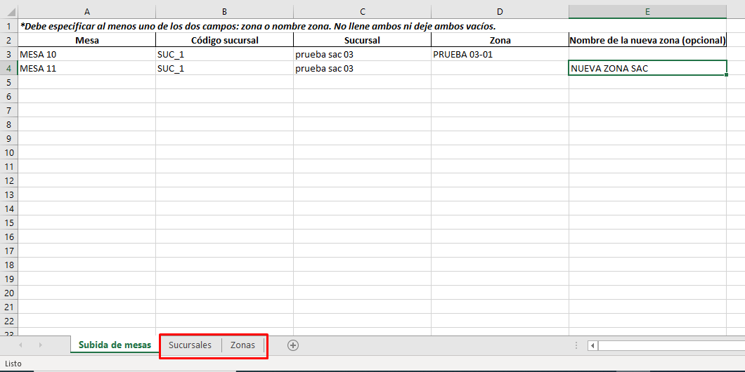 Si deseas saber el código de sucursal o zona, solo deberás dirigirte a las pestañas en la parte de abajo del Excel.