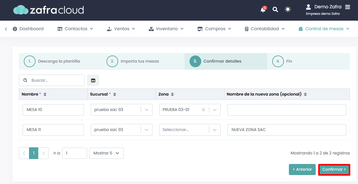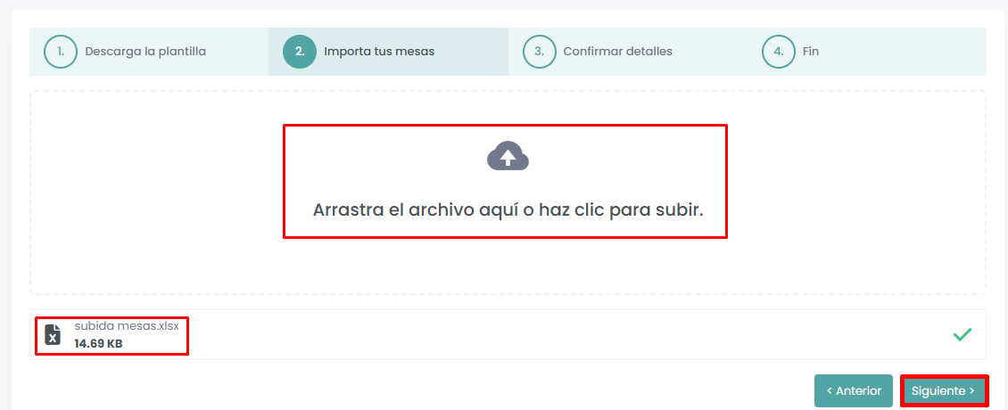 Una vez subido el archivo daremos en siguiente para corroborar los detalles de las mesas