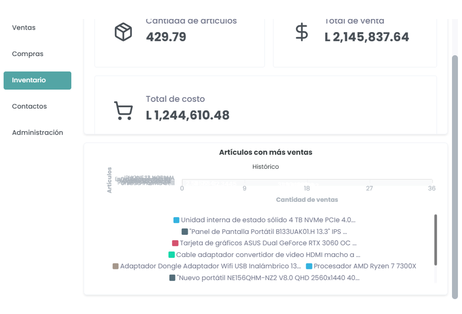 Artículos con más ventas: Muestra cuáles son los productos y servicio que más ventas se han realizado.
