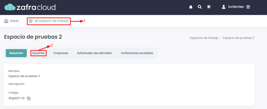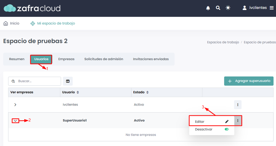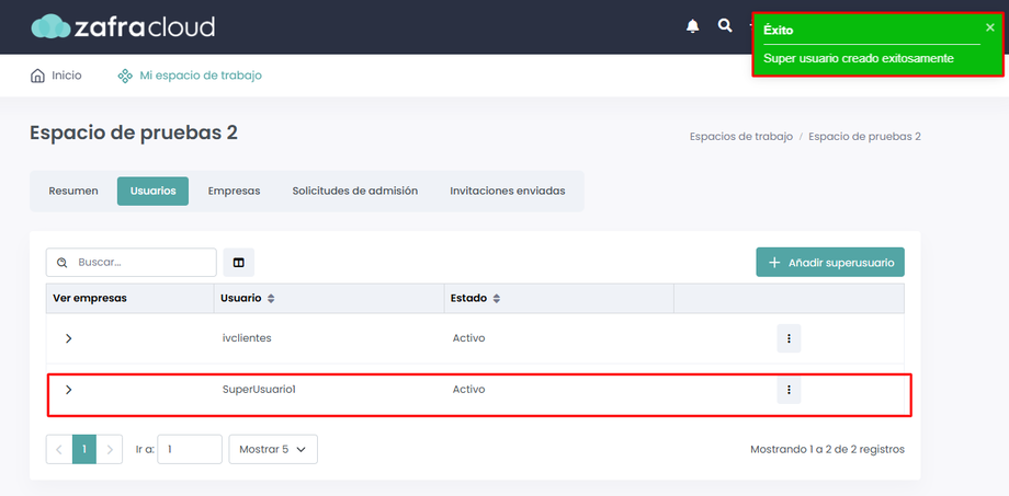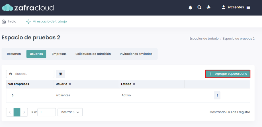 Para crear nuestro superusuario deberemos ingresar a Mi espacio de trabajo -> Usuarios
