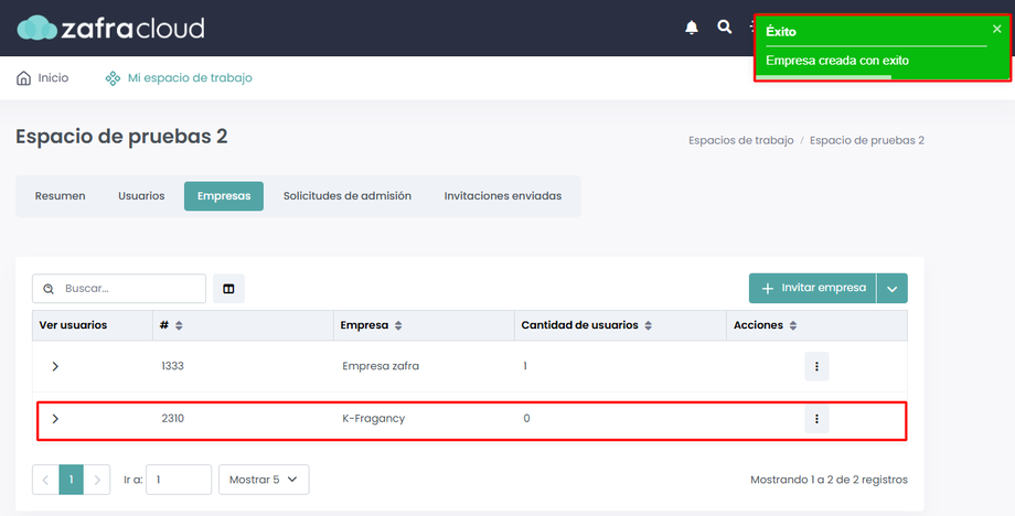 El sistema nos emitirá un mensaje indicando que la empresa fue creada con éxito.