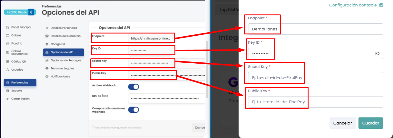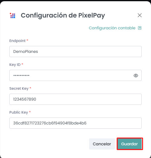 Nos solicitará las keys brindadas anteriormente por PixelPay; solo deberemos copiarlas y pegarlas en cada campo correspondiente: