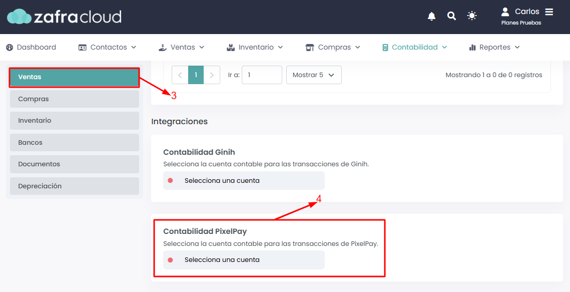 Seleccionarás Ventas, luego te diriges a la parte de abajo y seleccionarás “Selecciona una cuenta” para la contabilidad de Pixel Pay.