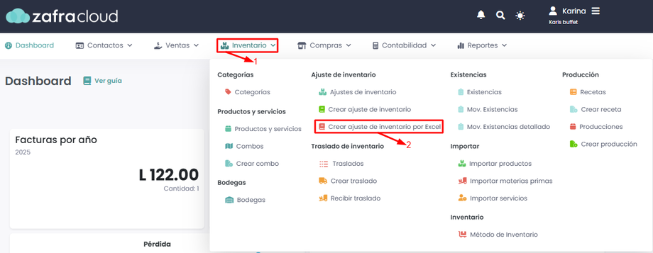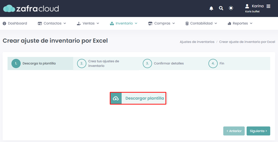 Ingresaremos al módulo de Inventario -> Crear ajuste de inventario por Excel.