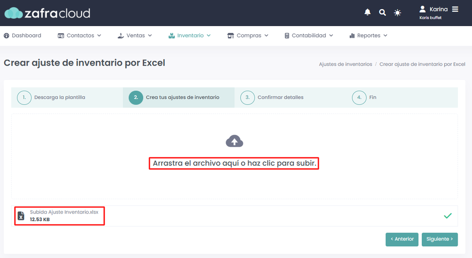 Una vez completado el Excel y guardados los cambios, regresaremos al sistema para subir el archivo como segundo paso.