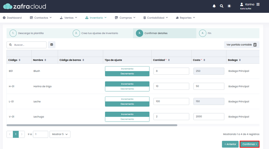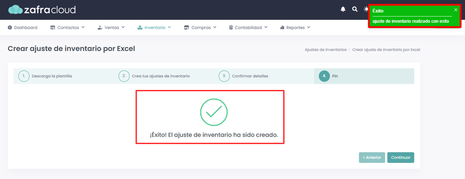El sistema emitirá un mensaje indicando que el ajuste de inventario fue realizado con éxito.