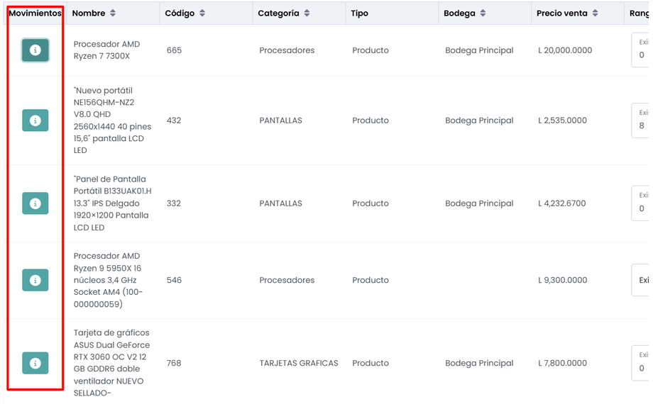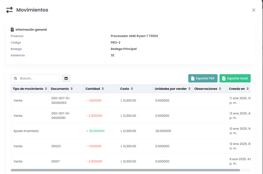 Además, se incluirán detalles como la bodega en la que se encuentra, las existencias actuales y el costo promedio.