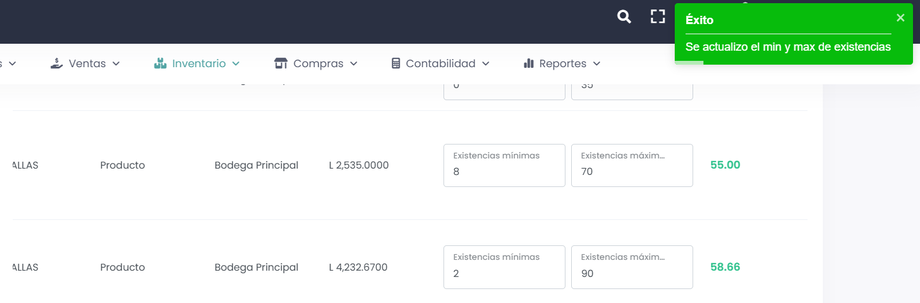 Para modificar las existencias mínimas o máximas, es necesario ajustar la cantidad según lo requerido y presionar la tecla Enter / Guardar Cambios.