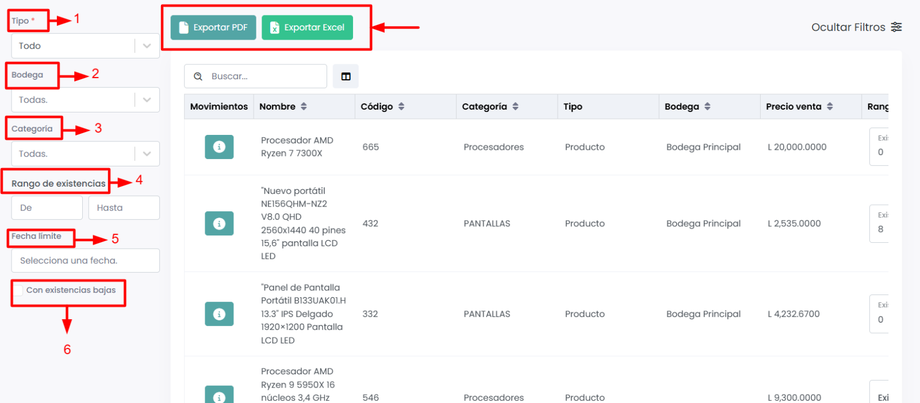 5. Existencia baja: Al activar esta opción, se filtrarán los productos con existencias bajas o nulas.