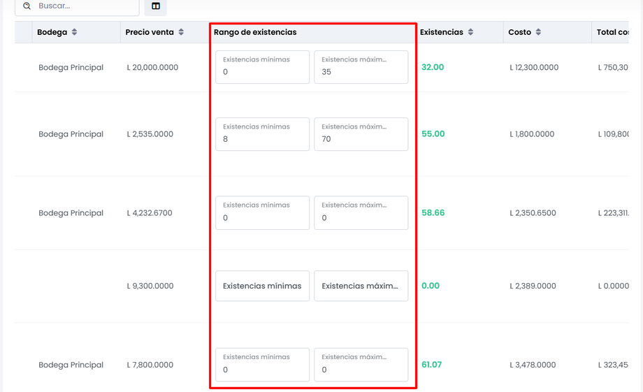 4. Rango de Existencias: Filtra de, hasta cuantas existencias deseamos ver.