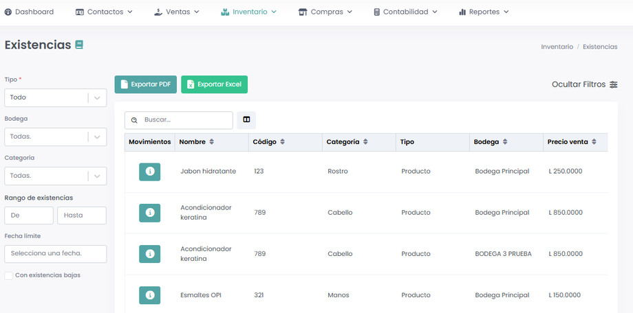 • Información general: Muestra datos clave sobre los productos en inventario, incluyendo detalles como nombre, código y cantidad disponible.