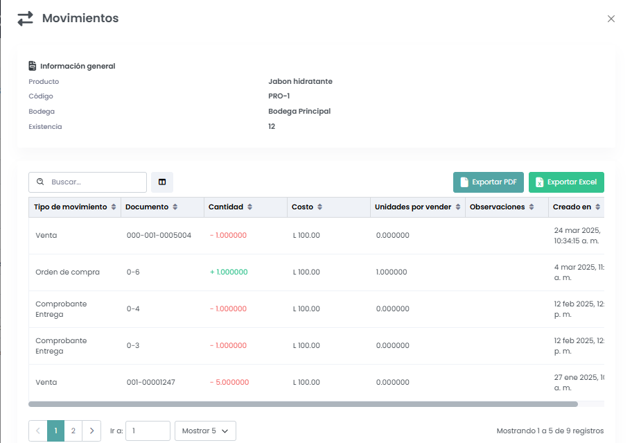 • Tipo de movimiento: Indicará si este fue ingresado por una solicitud de compra, un ajuste de inventario, etc.