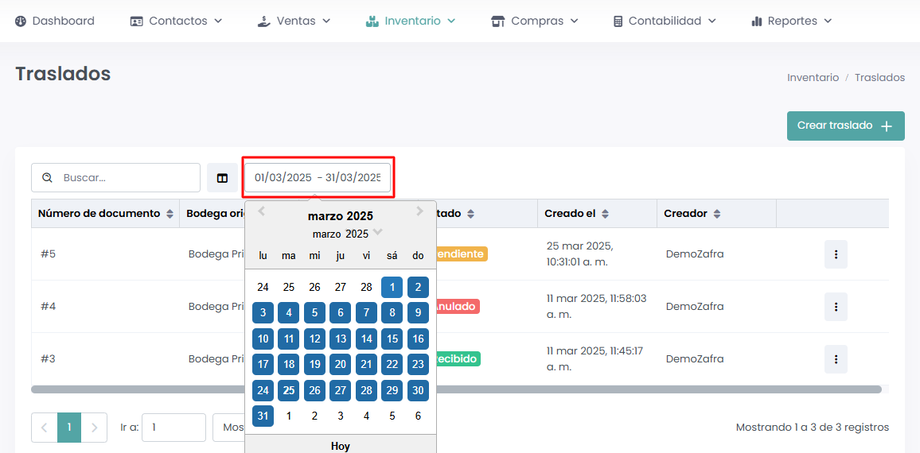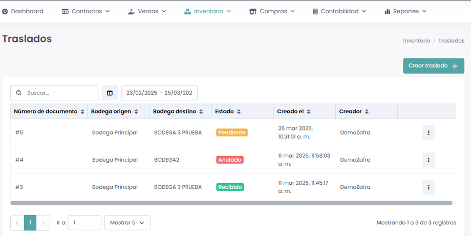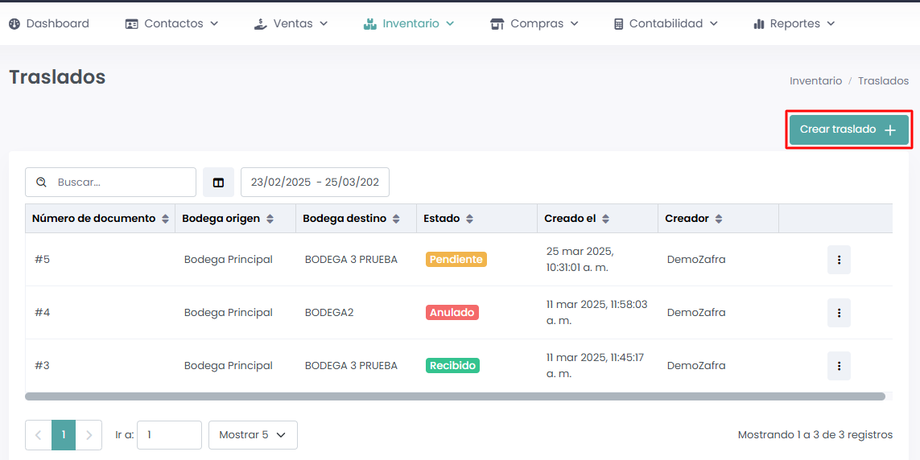 Como función adicional, podremos crear un traslado presionando el botón Crear Traslado +.
