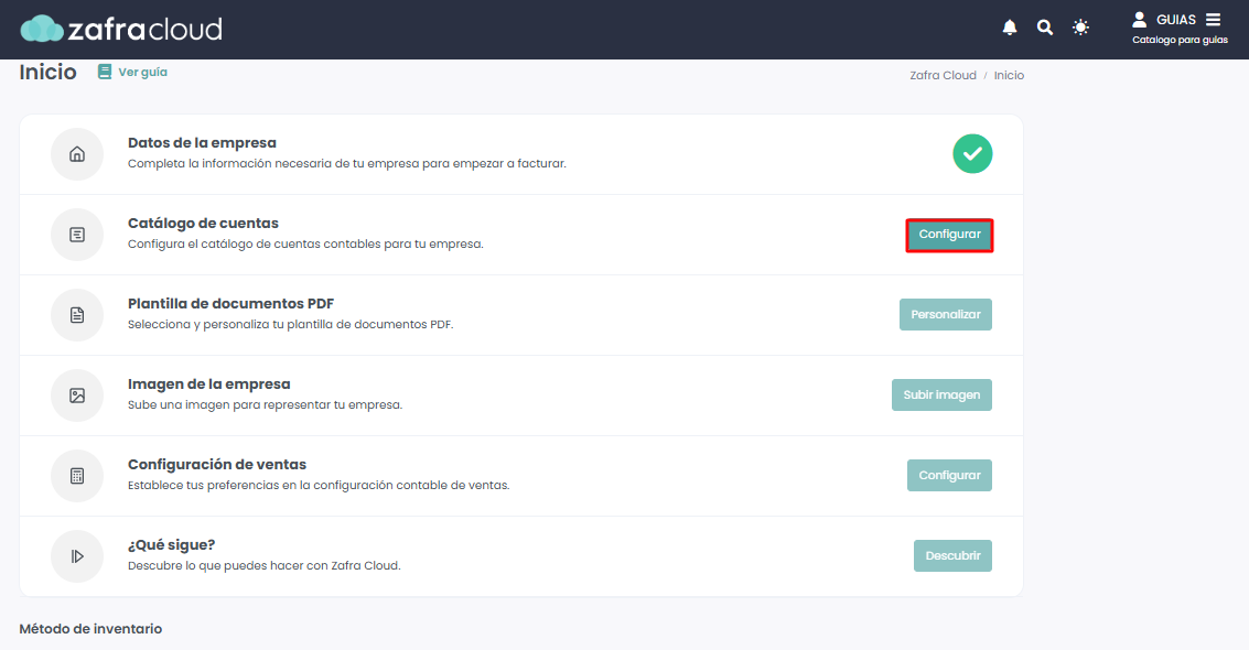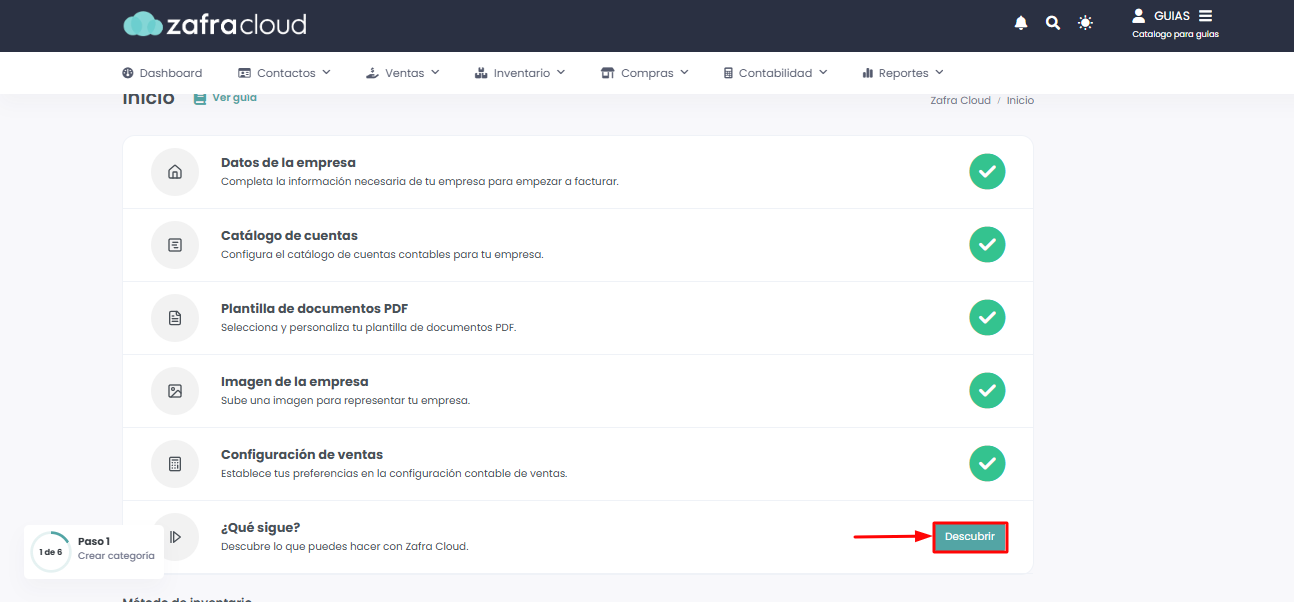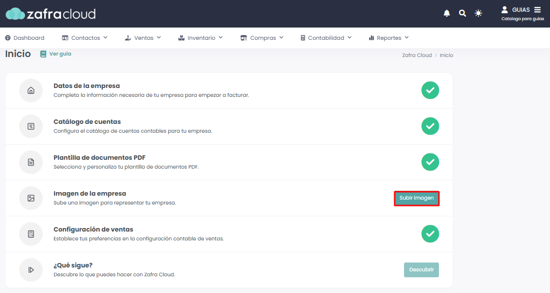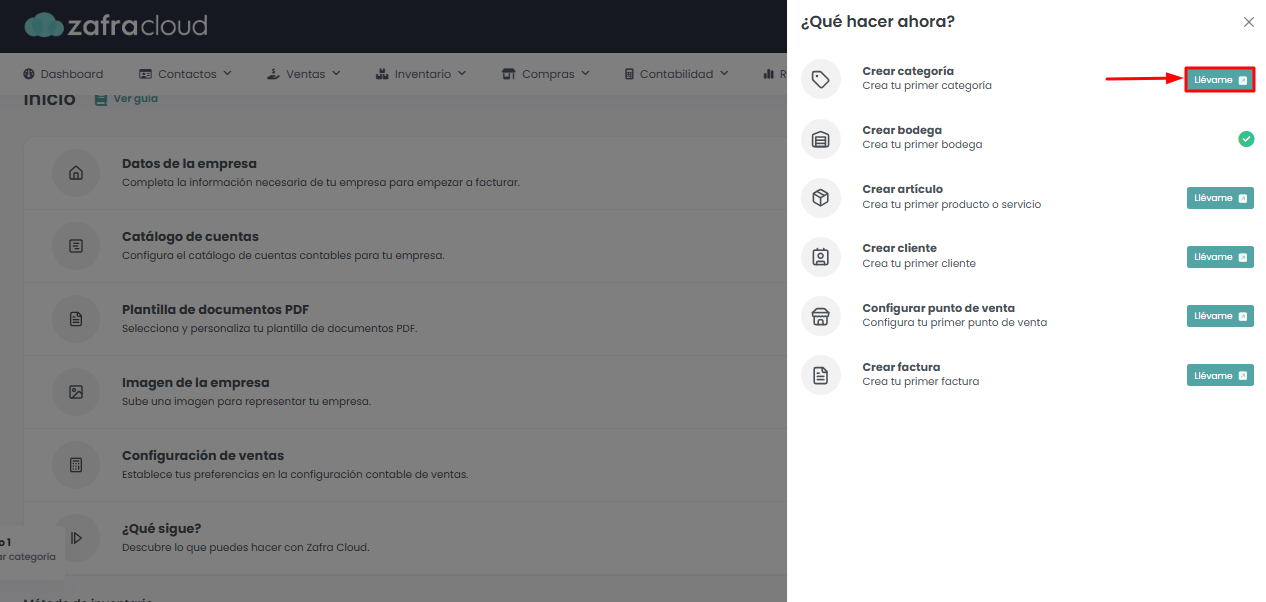 Luego de haber empezado sesión con nuestra prueba gratuita nos dará varios puntos de configuraciones de nuestra empresa.