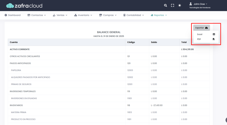 Para descargar el reporte en formato Excel o PDF, debe seleccionar el botón de “Exportar”.