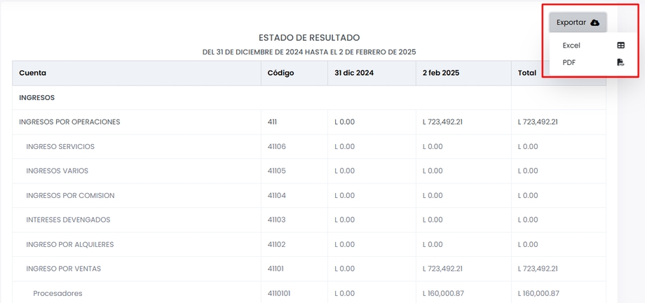 Para descargar el reporte en Excel y PDF debe de seleccionar el botón de exportar.