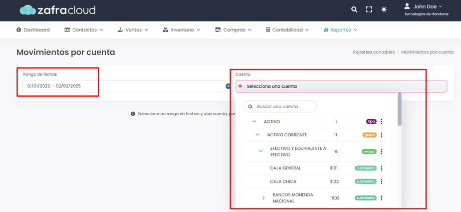 • Cuenta: Elija la cuenta específica que desea consultar (activo, pasivo, patrimonio, etc.).